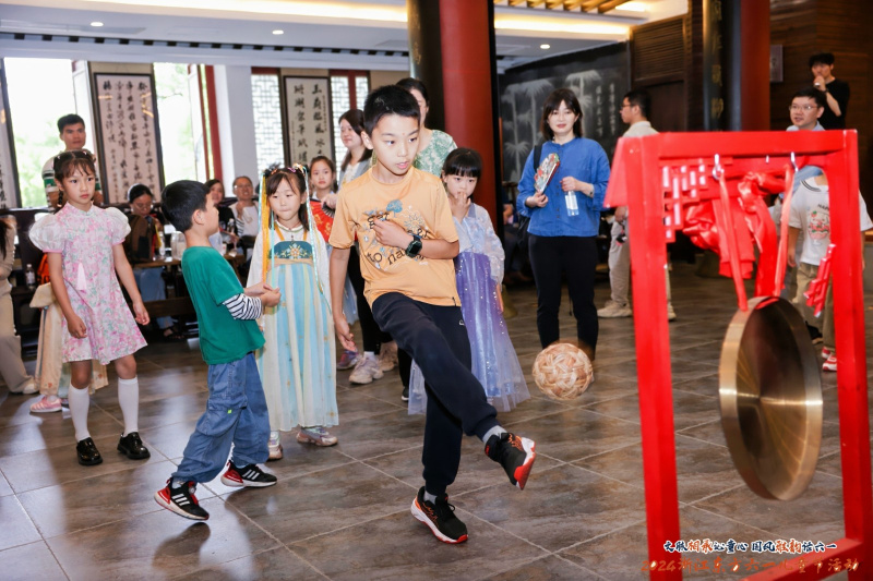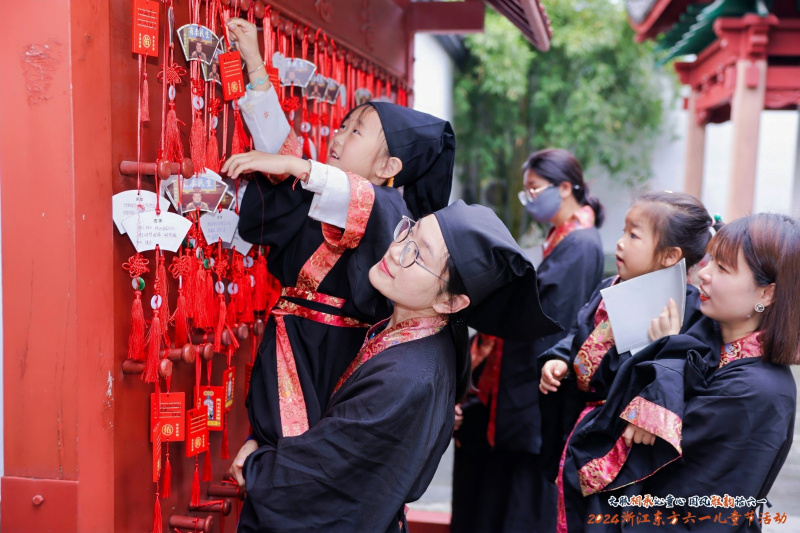 在國學(xué)成長儀式中,職工親子身著漢服,通過國學(xué)老師教導(dǎo),學(xué)習(xí)正衣冠、跨泮池、點(diǎn)朱砂等東方禮制,引導(dǎo)孩子知禮懂禮、樂學(xué)向善;通過叩拜孔子、誦國學(xué)經(jīng)典等莊重儀式,感悟仁義禮智信;通過向父母行三揖禮,表達(dá)孩子對父母養(yǎng)育教習(xí)的感恩之情。禮畢,職工親子共同在祈愿牌上寫下心愿,在孔廟放飛初心和夢想?,F(xiàn)場還設(shè)置了國潮趣玩游戲區(qū),孩子們在蹴鞠、投壺、旋轉(zhuǎn)陀螺游戲中大展敏捷身手,在“詩詞飛花令”挑戰(zhàn)里溫故知新、以詩會友。