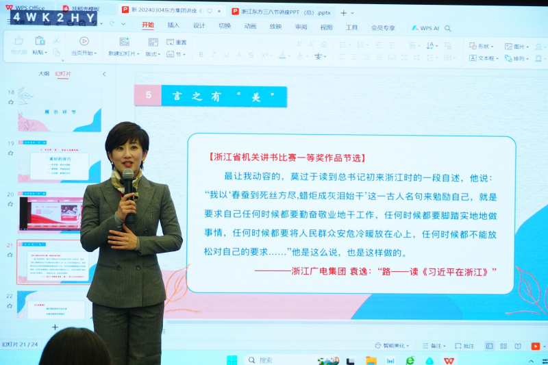 在魅力演說表達與技巧講座上,浙江工業(yè)大學播音與主持系教授李穎,就“如何提升女性演說表達技巧”進行現(xiàn)場講授和互動,通過二十大黨代表姜麗娟的《下姜村的新變化》、浙江省微黨課比賽一等獎作品山村支教女老師的《一個都不能少》、省直機關講書大賽特等獎獲得者袁逸的《跟著總書記讀好書》等三篇女性優(yōu)秀演講范例解析,讓現(xiàn)場職工在紅色作品中堅定信仰,從紅色文化汲取奮進力量。交流互動環(huán)節(jié),李穎教授從心理、情感、呼吸、禮儀等方面講授演說誦讀技巧,針對職工現(xiàn)場演說表演,給予點評和指導,讓女性“她”力量更具“言”值。